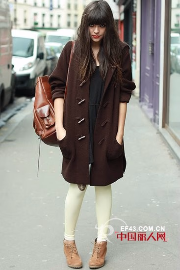 棕色牛角长外套搭配黄棕色双肩包带出学院风,小烟熏的妆容有着叛逆感。