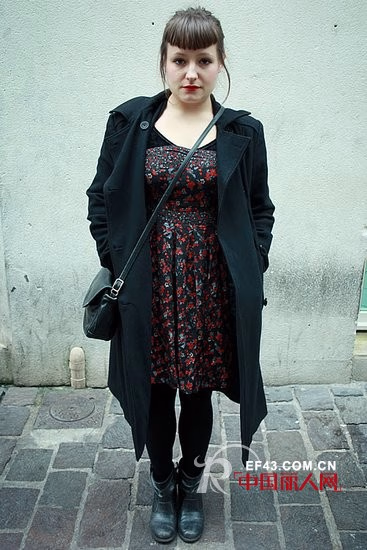 黑色宽大长外套能够把身材的缺陷都藏在里面,内搭碎花裹胸裙有着可爱感。
