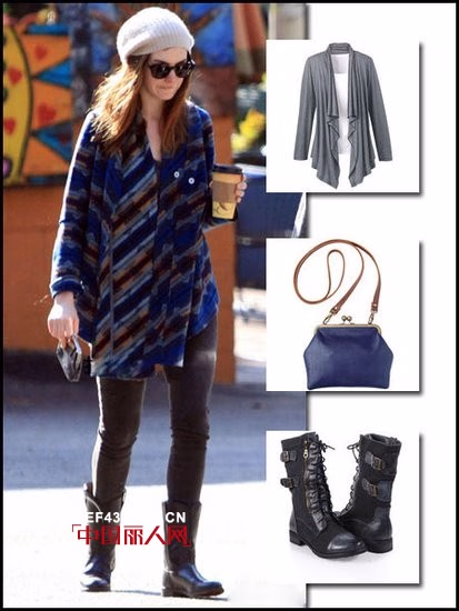彩色的拼接款式不规则外套,带给人们春天的感觉,配上黑色皮裤和黑色的靴子又有一种潮女的酷劲儿,搭配起来刚柔并济。