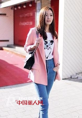 粉色的西装外套,嫩嫩的颜色本身已经甜美可人,内搭卡通图案的白色T恤,更先年轻气息,加上高腰牛仔裤,拉长腿部线条的同时,带来一种时尚feel!