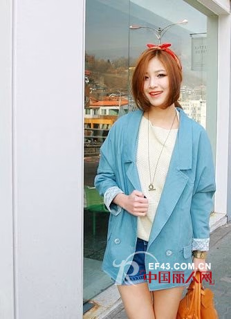 剪裁精致的蓝色西装,蕾丝的衣袖卷边,增加不少的甜美气息。搭配牛仔短裤展现恬静的邻家女孩范,想要风格更明显,记得把发箍搭上。