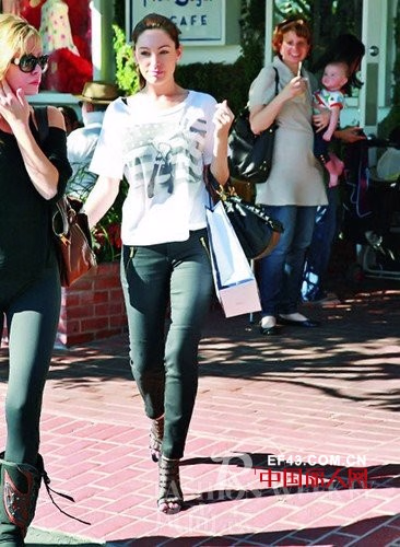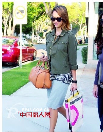 造型范例:Jessica Alba奶油色牛皮手袋和鞋子中和了军绿外套对肤色的破坏,斑马纹Tee说明她够敏感,所以左手的购物袋才如此刺目。