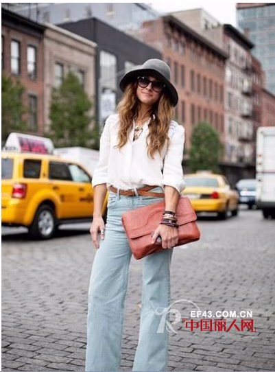 易显胖的宽腿牛仔裤一定要配上腰带,凹凸的腰身防止宽腿裤带来的臃肿感。把带有金属或琉璃装饰的腰链随意系在腰间,效果就很好。