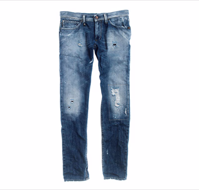 这条仔裤比较有设计感,破洞与补丁的处理增加了男人放浪不羁的味道。可以搭配背心加短款外套,制造一点层次感。