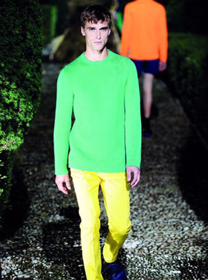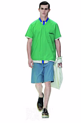 这种颜色非常特别,比蓝色浅,却又不像普通绿色那样过分炽热,它阴郁而幽雅,散发着一股理性的魅力,其名字同样别出心裁,水鸭绿和孔雀绿最近似蓝,松石绿和波斯绿则比曾经大热的薄荷绿更为迷离而深邃。在米兰时装周上,这些兼容并蓄的色彩贯穿始终:在Calvin Klein Collection,三款绿松石色的服饰成为整个系列的色彩亮点,与赭石色塑胶面料搭配,显现出一种颇具太空感的视觉效果;Jil Sander无疑是本季色彩风暴的集大成者,波斯绿、水鸭绿、湖蓝、柠檬黄、玫瑰色、珊瑚红等娇艳色彩比比皆是,撞色带来的极简比黑白灰更能撞击人心,令原来单调的服饰瞬时变得尖锐而个性十足;在Prada,外科医生般的诙谐优雅同样离不开颜色的塑造,孔雀绿的制服T恤搭配蓝灰色的短裤,讽刺而不拘一格的时尚触觉犹胜从前。