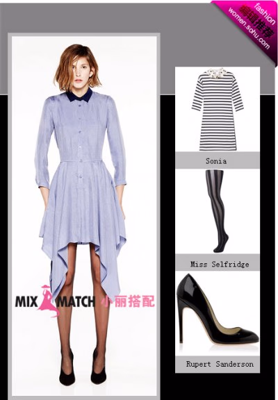 时尚解析:收腰的衬衫裙既具备衬衫的学院气质,又有裙装的优雅风范。不规则的下摆剪裁设计感十足,搭配黑色丝袜和单鞋,妩媚中透露出一丝小性感。