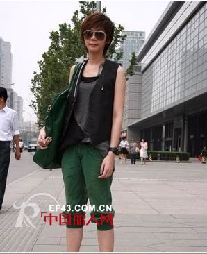 黑色吊带无袖子两件套配条军绿色七分裤帅气十足哦。