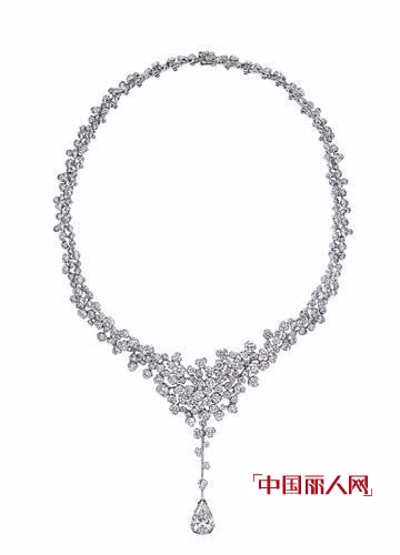 1932年,Coco Chanel 创作了一系列时尚超前的绝美珠宝。而这件“Cascade”项链正是专为配合经典小黑裙的领口设计,由18K 白金打造,镶嵌1颗5克拉梨形切割主钻及287 颗总重42 克拉圆钻。几乎隐形的片形金属串联,凝结成瀑布的效果,呈现出梦幻般的美感。优雅美丽,装饰性极强。