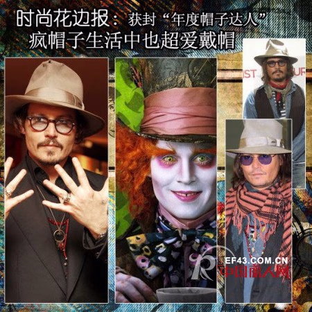 约翰尼-德普在美国帽业协会网站的评选中击败格温-史蒂芬妮、休-杰克曼等明星荣膺“年度帽子达人”(hat person of the year)称号,《爱丽丝梦游仙境》里的“疯帽子”不仅在电影中是个帽子狂人,在生活中也经常戴着帽子出席各种活动。
