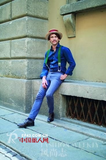 色彩撞击是2011巴黎春夏时装周的一个亮点,意大利的制衣商人Lorenzo身上特别值得一提的是那条浓郁的草绿色背带,随意搭在湖蓝色衬衫上,饱和度直逼草帽上的酒红点缀。意大利男人的性感,也许与相貌无关。