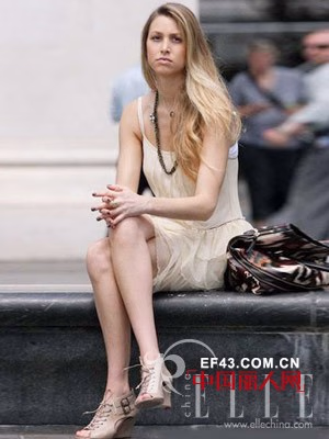 惠特尼-波特的连衣裙淡雅大方的色调甜美又优雅,浪漫的雪纺材质既凉爽又具美感,搭配上时下流行的裸色坡跟绑带露趾凉鞋,展现波特优雅女人味。