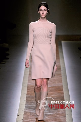 华伦天奴 (Valentino) 2011秋冬女装秀在保持浪漫纯美的基础上尝试简洁成熟的款式设计令人耳目一新。模特露比·阿尔德里奇 (Ruby Aldridge) 以一件拼接感连衣裙走开场,简单的条纹肌理是唯一丰富视觉效果的细节,从第二身Look开始,我们在大衣外套上便看到了华伦天奴 (Valentino) 一贯对流畅线条美感的追求,圆滑的领部流露出内在的优雅。随后又出现了皮革滚边大衣和皮革风衣,以及点缀着铆钉的裙装,让女士们的着装多了些许硬朗,又不咄咄逼人。