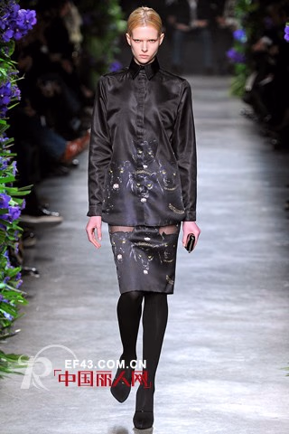 2011秋冬,纪梵希 (Givenchy by Riccardo Tisci) 的暗黑世界里开满了紫色的兰花与鸢尾,一群凶猛的黑豹盘踞在衣襟与裙摆上,金色的眼睛不停闪烁。 黑色棒球帽上竖起尖尖的“猫耳”,里卡多·提西 (Riccardo Tisci) 这一季打造的“猫女郎”们用光亮的丝缎衬衫、印花棒球夹克与宽松针织衫来搭配紧窄的及膝铅笔裙,性感中带着几分强势的中性化色彩。