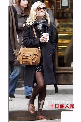 克里斯汀·邓斯特(Kirsten Dunst)的ProenZA Schouler肩包:Kirsten Dunst成功穿出一身学院风格,多亏了这款Proenza Schouler线下的雨布包,PS:发现没有?Kirsten特意没有系上包上的带扣。