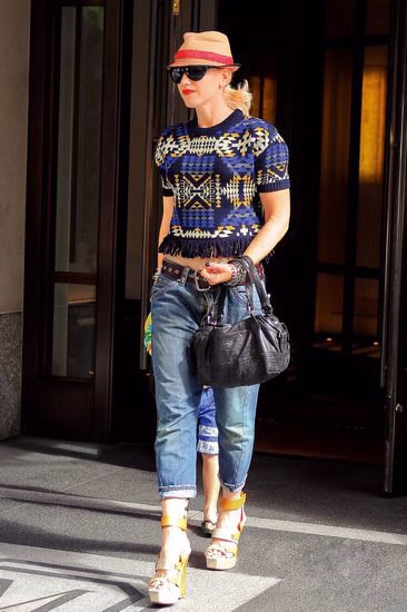 Gwen Stefani :上下两件都是热门之选,北欧风情毛衣+ 卷边仔裤,毛衣的流苏边很有特点。