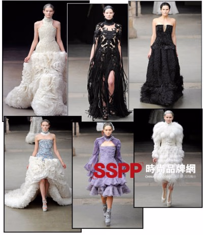 莎拉·伯顿(SarahBurton)第二次设计亚历山大·麦昆(AlexanderMcQueen)2011秋冬时装秀。SarahBurton将童话故事的浪漫以AlexanderMcQueen式的精神来诠释,以黑色与白色串起全场,中间的灰与淡紫色,还有那几件用了好似陶瓷组合而成的设计。