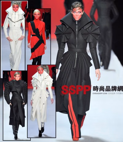 高高竖起的大翻领,红白黑的强烈对比,立体褶皱如同史前生物身上的尖刺般四散张开,维果罗夫(Viktor&Rolf)2011秋冬女装秀场上,麻豆们个个表情严肃,浑身上下散发着“不要靠近我”的强大气场。 Viktor&Rolf在巴黎时装周上发布了2011/2012秋冬女装系列。设计师ViktorHorsting及RolfSnoeren同样是荷兰人,自推出第一个Ready-to-wear系列,Viktor&Rolf便正式踏上时装舞台,其带点玩味的设计及独特的时装美学概念,一直是时装传媒的焦点。