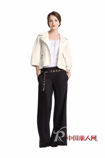 时尚点评:黑色的裤腿裤有很好的修身效果,腰间的金色细腰带作为点缀很合适。