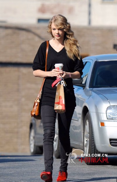 黑色的V字领针织衫搭配同色系紧腿裤,显得瘦瘦的。一双大红色的平底鞋,吸引了路人的眼球,可谓点睛之笔。