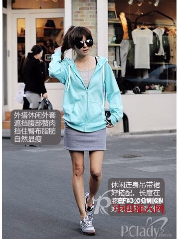 休闲吊带裙在春天可以直接穿上身,膝盖10公分的长度刚好显露腿部修长感。担心腰上赘肉就搭件连帽衫吧,毫无刻意遮肉自然显瘦。