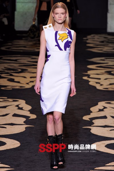 范思哲(Versace)发布2011秋冬女装新品,本季设计干练、利落、英气十足。性感的高开衩与直线型的单肩、斜肩剪裁,腰侧加上军服口袋作为装饰。简笔勾勒的郁金香图案在裙装一侧蔓延开来,紫罗兰色与明黄、翠绿色对撞,强烈的色彩对比更增添了咄咄逼人的强势气场。高腰短夹克与皮革短裙搭配出帅气造型,彩色蟒蛇纹皮革在黑色连身裙上勾勒出简洁的曲线。