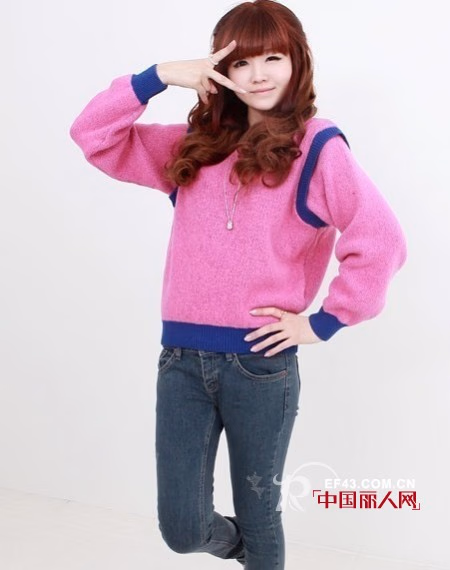假两件式的圆领短款针织衫,拼接色翻边设计,清新舒适