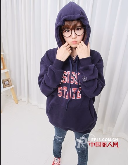 藏蓝色袋鼠兜字母抽绳连帽长款卫衣,休闲时尚百搭