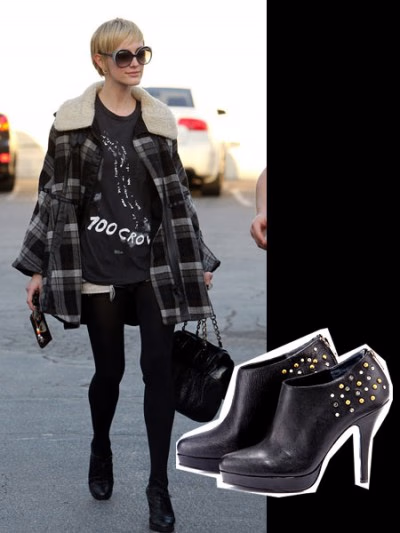 好莱坞潮妞儿阿什莉-辛普森身着深灰色T恤外搭翻毛领格子案斗篷外套,下搭黑色丝袜,脚穿黑色雕花高跟皮鞋,挎FENDI包,潮味十足。