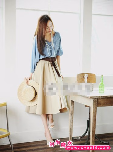 用粉蓝的棉麻宽松衬衣配上乳白的亚麻长裙,使简单的蓝白更趋近于自然的颜色,搭配宽边腰带、珍珠项链和太阳帽、鱼嘴鞋 ,兼职是油画中走出的田园少女。