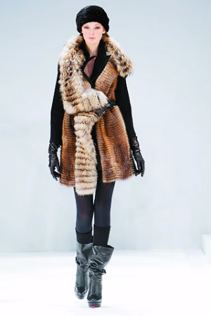 搭配TIPS:如果觉得大面积皮草设计过于夸张,小面积奢华皮草搭配,则显出灵巧和多变的风格。用光彩夺目的皮草点缀各式披肩,紧身夹克或短夹克,点缀于领口、衣袖、翻领或者滑雪穿的长毛靴,或用超短款蓬松小皮草短衣,搭配紧身裤和长靴,就能把张扬的野性皮草用妩媚的女人味来掩饰,耐人寻味。