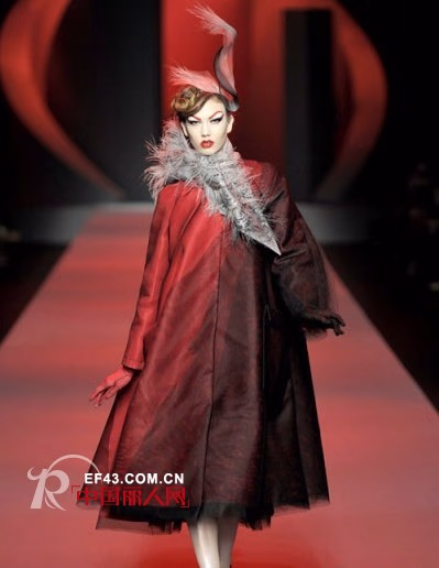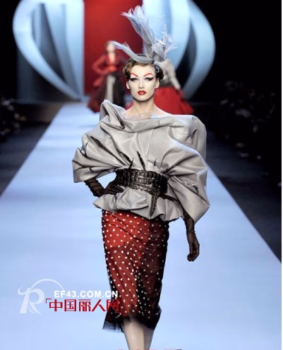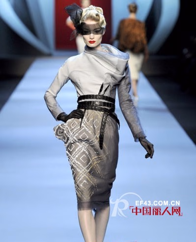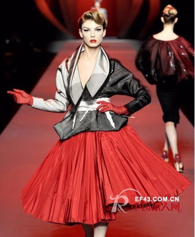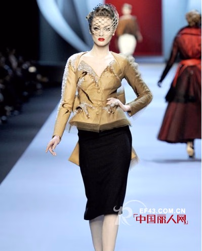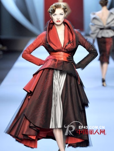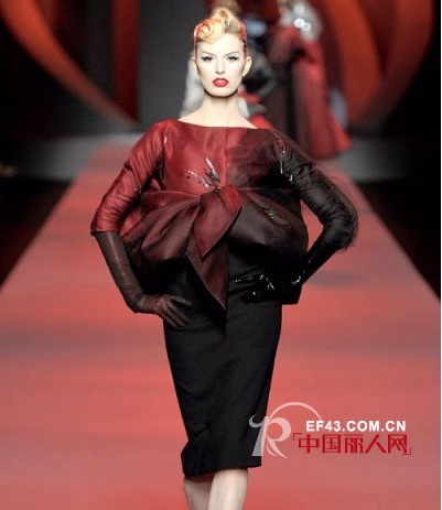 迪奥(Dior)2011春季高级定制系列,富有戏剧感的红装作为开场,罩在外层的黑色薄纱显得神秘妖娆。束腰紧身上装与多层褶皱伞裙的对比,更突出女性纤细的腰线与优美的身体比例。接下来收腰上装与铅笔裙的搭配高贵优雅,面纱与长手套的搭配更让人怀恋起消逝已久的名媛气质。蓬松的宫廷袖、膝盖处微微收拢的裙摆柔软而富有体积感的褶皱、在腰间蓬开的伞状下摆……花朵造型被巧妙地融进服装之中,用珠宝镶嵌、刺绣将花朵的形状直接呈现。层叠的轻纱与柔美的水彩色完美组合,模拟着插画中的光影变化。