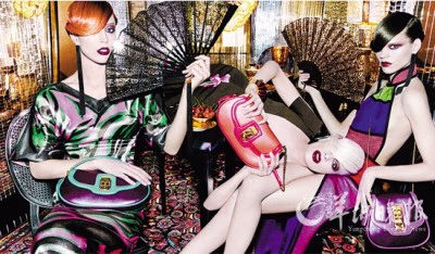 路易威登正式揭幕2011春夏女装系列宣传广告,本季广告依然由来自纽约的摄影师Steven Meisel掌镜,Freja, Kristen以及Raquel三位模特共同出镜演绎华丽坎普风。与上一季优雅成熟的女性气质表达迥然不同,本季广告画面呈现出颓靡精致的华丽风格,画面中,在巴黎春夏时装秀上以裸身彩绘斑马纹而引人注目的压轴模特Freja与Kristen,同Raquel一起身着夺目色彩与闪烁材质的时装,手持蕾丝折扇与华丽手包身处耀眼夺目的70年代风格环境中,营造出令人神魂颠倒的独特影像。