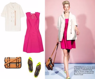 时尚解析:春季最适合鲜艳的颜色,白色羊绒开衫搭配桃红色礼服短裙,活泼中凸显优雅,再加上皮质复古拎包更展现出帅气的一面。最后以草绿和棕色的平底鞋搭配,无疑会使你在早春形成一道亮丽的风景。