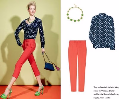 时尚解析:波点衬衫向来是时尚者们的大爱,看似平常的蓝的波点衬衫搭以橘红色七分裤,干练中多一分帅气。或许你会觉得没有春天的感觉,那么青绿色的配件以及同色的波点高跟凉鞋便是对春天最好的诠释,鞋和衬衫的呼应更展现出你对生活的细心。这身装束走在街头,你就是春天最有活力的风景。