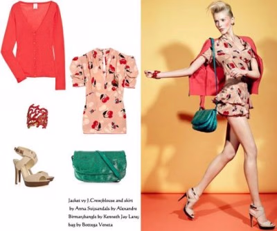 时尚解析:红色的羊绒开衫配以樱桃花色的连衣短裙,便是舒适与华丽的结合,就好像春天清风拂面的感觉,樱桃的花色更能体现你充满活力的一面。用蓝绿色的蛇皮斜挎包点缀,仿佛看到了又一年的新绿,最适合早春时节。红色的金属手环和米色的高跟凉鞋更为这身装束增加无限生机。