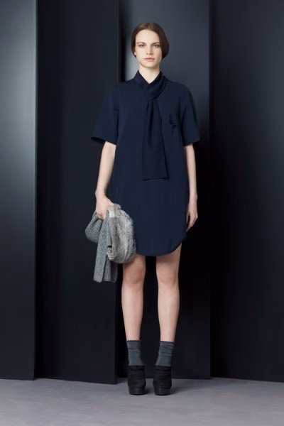 那些渴望复制Phillip Lim成功经验的设计师应该学习一下他此次早秋季系列中的混色绉纱 “运动衫”。Lim看到助手在工作时穿着运动衫,他十分喜欢这种打扮,于是就用舒爽的混色纱设计了自己的几个版本,并在服装的领口处装饰了一些水晶。这真是个聪明的做法。因为尽管运动装扮有可能吸引时尚人士,但对于大多数人的着装规范来说,运动装并不适合办公室穿着。讲究功能一直被视为Lim引人注目的特点,这次的早秋系列再次进行了验证。比方说那款未经处理的兔毛大衣,其内衬采用了海军蓝色。前部缠绕式的长裤以及具有悬垂衣片的上衣显得无比时髦。而且,此举将取悦90年代设计师Helmut Lang的粉丝。Lim还在衣服的袖窿处加上带子,当人们将衣服搭在肩上的时候可以更好地进行固定。