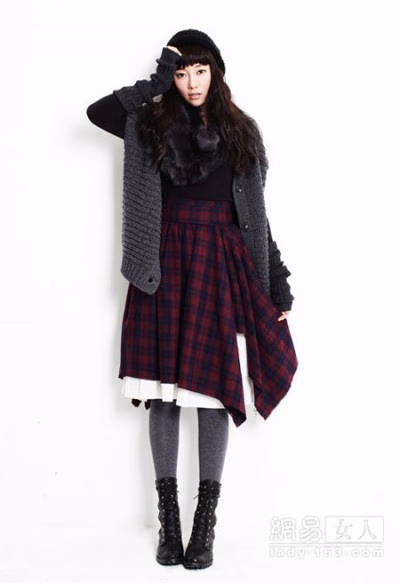 深色的格纹短裙看起来很呆板,但是混搭酷酷的短靴,十分个性。