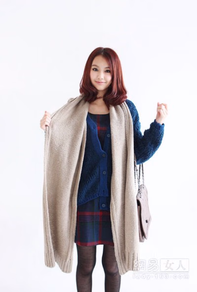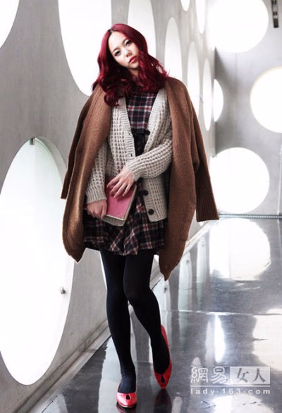 格纹衬衫混搭毛开衫,整个Look看起来很有层次感。丝袜的搭配更是增强了整套的通透性,性感十足!