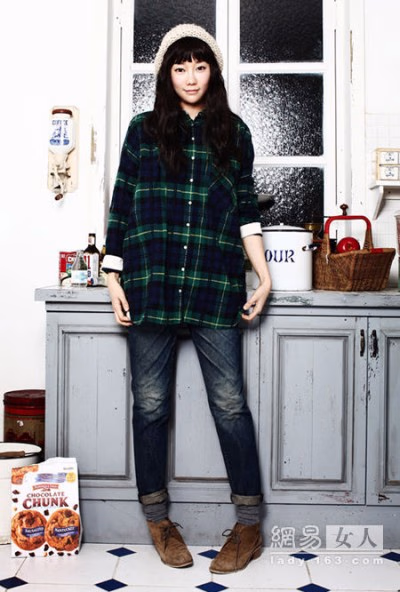 格纹衬衫搭配男友式牛仔裤和棕色做旧皮鞋,很有英伦范儿。