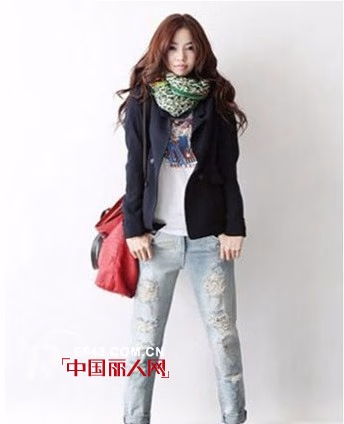 秋冬最拉风的图案非斑点莫属啦,无论是豹纹还是波点都是永不褪色的时尚经典,搭配任何大衣、外套、卫衣或者衬衫都会很耐看,在很乖巧的学员装风格上搭配条浅绿色豹纹印花图案围巾,配合仔裤破洞设计让人感觉形象显得乖张又叛逆,搭配红色挎包对比十分突出,很靓眼的视觉效果。