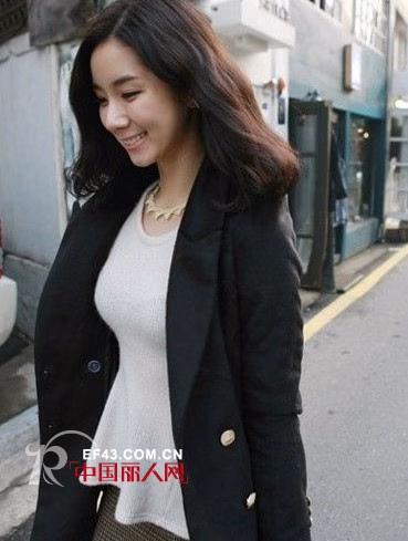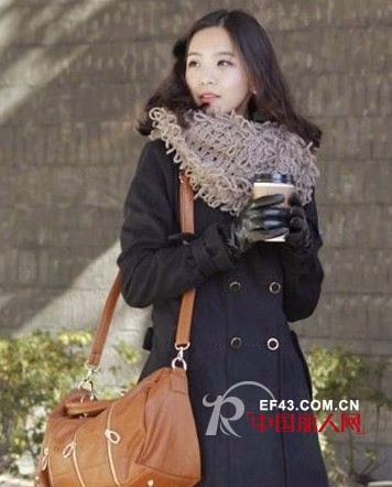 典雅大方的黑色款大衣双排扣设计简约又时尚,搭配上保暖的打底裤,显得十分干练,圆圈针织围巾独特个性的设计百搭又可人。