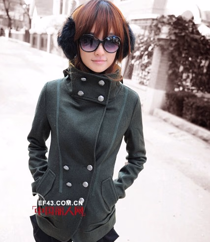 帅气十足的一款军装毛呢外套,领口以特殊的设计,衬托女性中硬朗的味道,四个银色扣子严谨中不忘时尚