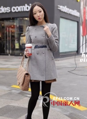 烟灰色双排扣呢子大衣尽管本身就是收腰设计,但是倘若少了这条蓝色皮质腰带似乎就不那么完整了,下摆露出内搭短裙边凸显层次感,黑色紧身带底裤展现腿部均优雅线条。