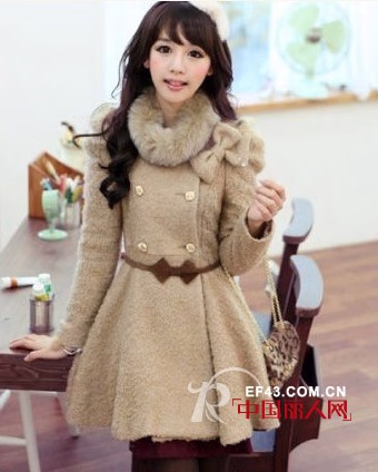 驼色大衣非常甜美可人,下摆的宽松设计带有裙装的色彩,蓬蓬袖的合身剪裁搭配胸前蝴蝶结很有公主气质,领子处的皮草装饰不仅高雅还有瘦脸的功效,腰间的棕色蝴蝶结腰带更是令整体锦上添花。