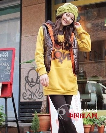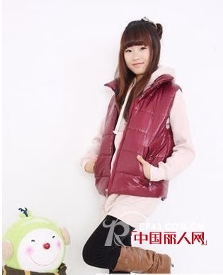 同样是一款棉衣小马甲 ,不同的搭配就给人不一样的感觉,搭配一件亮丽的卫衣,整个冬天的颜色就开始鲜艳,再加上一双雪地靴 ,绝对的可爱小公主。