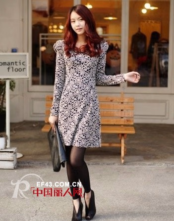 复古感觉的印花连衣裙,泡泡袖跟领口做的比较大,露出锁骨更性感,下身配上打底裤跟鱼嘴靴让你一下变身复古摩登女郎!