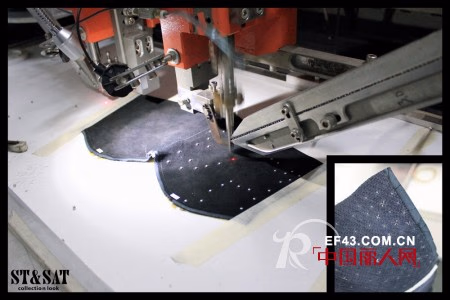 自动铆钉机,据说是目前在整个业界都算比较先进的机器,通过电脑设定版式后会自动打钉,这样形成的图案均匀、漂亮,速度快,而且以反扣式把铆钉钉入面料,就不易掉落。也就是说,如果以前你有遇到过鞋子上装饰的铆钉饰物有脱落现象的话,那么现在在星期六(ST&SAT)就不用担心这个问题了。