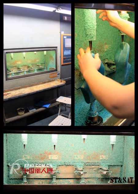 最先来到的是准备组,在这里会完成各项辅料的准备工作,包括皮革、蕾丝等面料的裁切,然后印刷(丝印)LOGO、削皮、定型等。我们鞋子平常所能见的任何一部分,例如舒适的皮绒面料、性感漂亮的蕾丝花边、精致的细高跟、甚至鞋底的烫金LOGO等等,都会在这里准备好全部素材。为减少不必要的人力成本浪费,并提高工作效率,星期六女鞋(ST&SAT)率先引入了有“数字化切割专家”之称的智能皮革切割机。这台机器采用自主研发的嵌入式数控系统,美国进口的CPU和精密的电子元件,稳定性和操作性均达到国内外领先的技术水平,可以实现快速排版,高效切割,省时、省力、省材料。完全突破传统企业长期依赖工人手工作业的瓶颈,率先进入数字化无刀模加工时代。