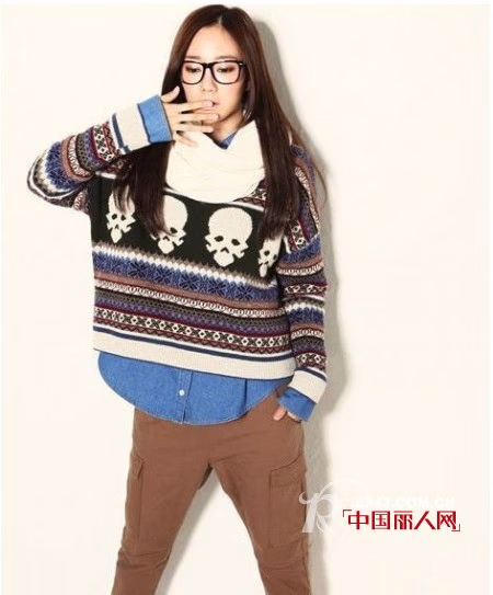 带有骷髅头图案的毛衣和其他花色图案的修饰令此短款毛衣多了几分孩子气的俏皮感。内搭牛仔衬衣,个性十足。