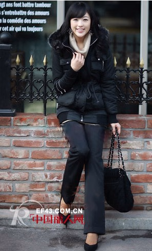 这样的短棉衣内搭浅色毛衣的组合十分打眼,俏皮的组合展现淑女气质。黑色修长长裤拉长腿部线条,非常时髦。